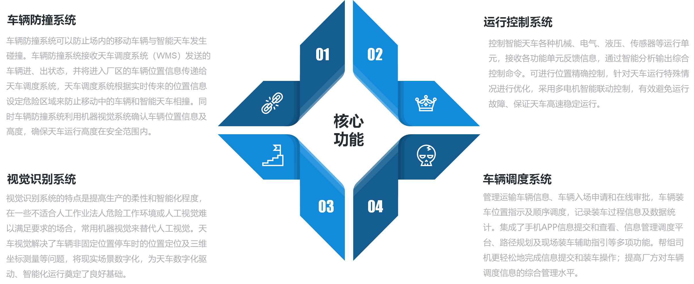 天車智能化解決方案以高效智能的自動(dòng)化物流設(shè)備和智能倉(cāng)儲(chǔ)技術(shù)為依托,結(jié)合生產(chǎn)現(xiàn)場(chǎng)工藝,構(gòu)建在先進(jìn)的工業(yè)以太網(wǎng)上,運(yùn)行于計(jì)算機(jī)系統(tǒng)與數(shù)據(jù)庫(kù)環(huán)境下的智能物流管理平臺(tái)。系統(tǒng)包含信息化、智能倉(cāng)儲(chǔ)管理、生產(chǎn)調(diào)度、可視化等子系統(tǒng),將成為有效協(xié)調(diào)智能倉(cāng)儲(chǔ)管理、生產(chǎn)調(diào)度、物料自動(dòng)配送的調(diào)度核心和管理中心。為數(shù)字化工廠的改造打造升級(jí)提供自動(dòng)化、信息化、智能化的技術(shù)解決方案。